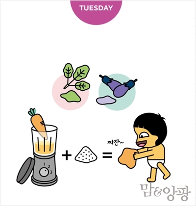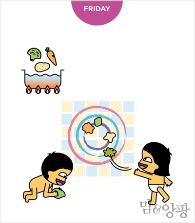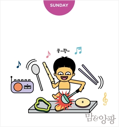 앞치마·숟가락·국자·젓가락 등 두들길 만한 도구와 채소를 준비한다. 채소를 도마 위에 올려놓고, 아이가 좋아하는 동요나 노래를 틀어놓은 뒤 함께 두들기며 리듬을 탄다.