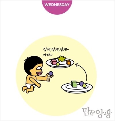 우엉·콜라비처럼 단단한 채소와 미나리나 시금치같이 부드러운 채소를 고루 준비한다. 아이가 집기 좋은 정도의 크기로 채소를 잘라 그릇에 담는다. 반대편에 빈 그릇을 두고 채소를 옮긴다.