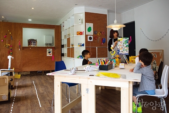 자동차 상자를 건네받은 순형이는 곰곰이 생각하더니 초록 색종이를 오린다. 생각한 모양이 나오지 않았는지 색종이에 원하는 모양을 그려 엄마에게 오려달라고 부탁한다. 그사이 하양·파랑· 빨강 클레이를 꺼내 자동차 머리 위에 붙인다. 차근차근 생각해가며 만든 자동차는 어린이집에 간 동생 선유가 오면 태워줄 생각이다. 워크숍에 처음 참여하는 규현이는 미술교육이나 놀이활동 경험이 전무하다. 수업이 시작되자 척척 자신의 생각대로 자동차를 꾸미기 시작한 순형이를 한참 동안 쳐다보더니 “선생님, 무지개 색깔 자동차를 만들래요”라고 말하며 일곱 빛깔 크레파스와 마스킹테이프로 자동차를 꾸미기 시작했다. 바퀴는 규현이가 좋아하는 파랑ᆞ초록ᆞ노랑색과 엄마가 좋아하는 분홍색 종이 접시로 끼웠다. 두 시간 가까이 작은 손을 꼬물거리던 아이들은 각자 개성을 듬뿍 담은 자동차를 만들어냈다. 신나게 달리기 시합을 하고 난 뒤 첫 만남의 서먹함은 잊고 나란히 앉아 색종이를 오렸다. 아이들의 아트워크는 아직 끝나지 않은 모양이다.