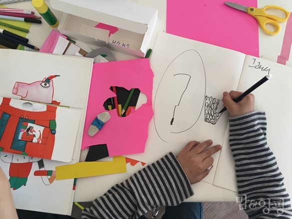 “순형이는 2년 동안 미술학원에 다녔는데, 아무리 창의적인 수업 방식이라고 해도 시간이 지나면서 틀에 갇히는 것 같더라고요. 파파워크룸 워크숍은 아이가 자유롭게 생각을 펼칠 수 있어 좋아요. 집에서 하기 힘든 활동을 해서인지 아이가 자꾸 가고 싶어 해요.” 순형(만 5세) 엄마 염수진